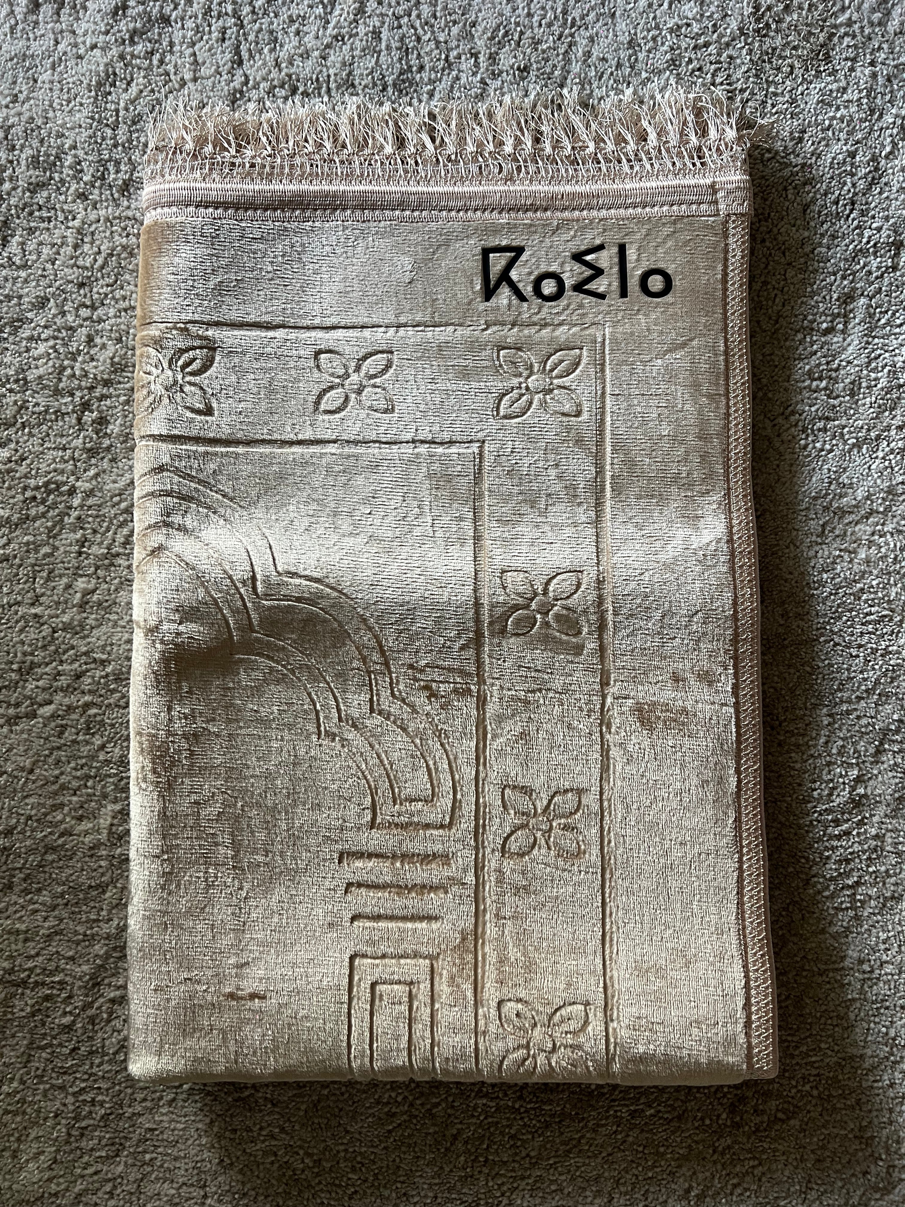 Prénom en tifinagh, apposé en haut du tapis - partie orientée vers la Qibla, symbole de recueillement et de respect