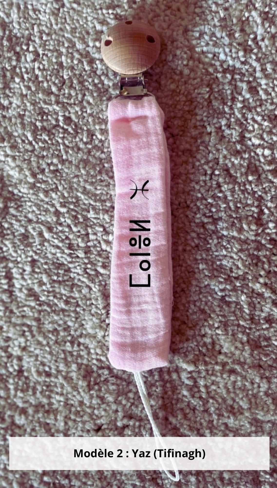 Le prénom est en tifinagh ou latin. Les symboles ne sont pas au choix libre : sélectionnez un modèle (photo 1, 2, 3 ou 4) qui associe alphabet + paire de symboles.