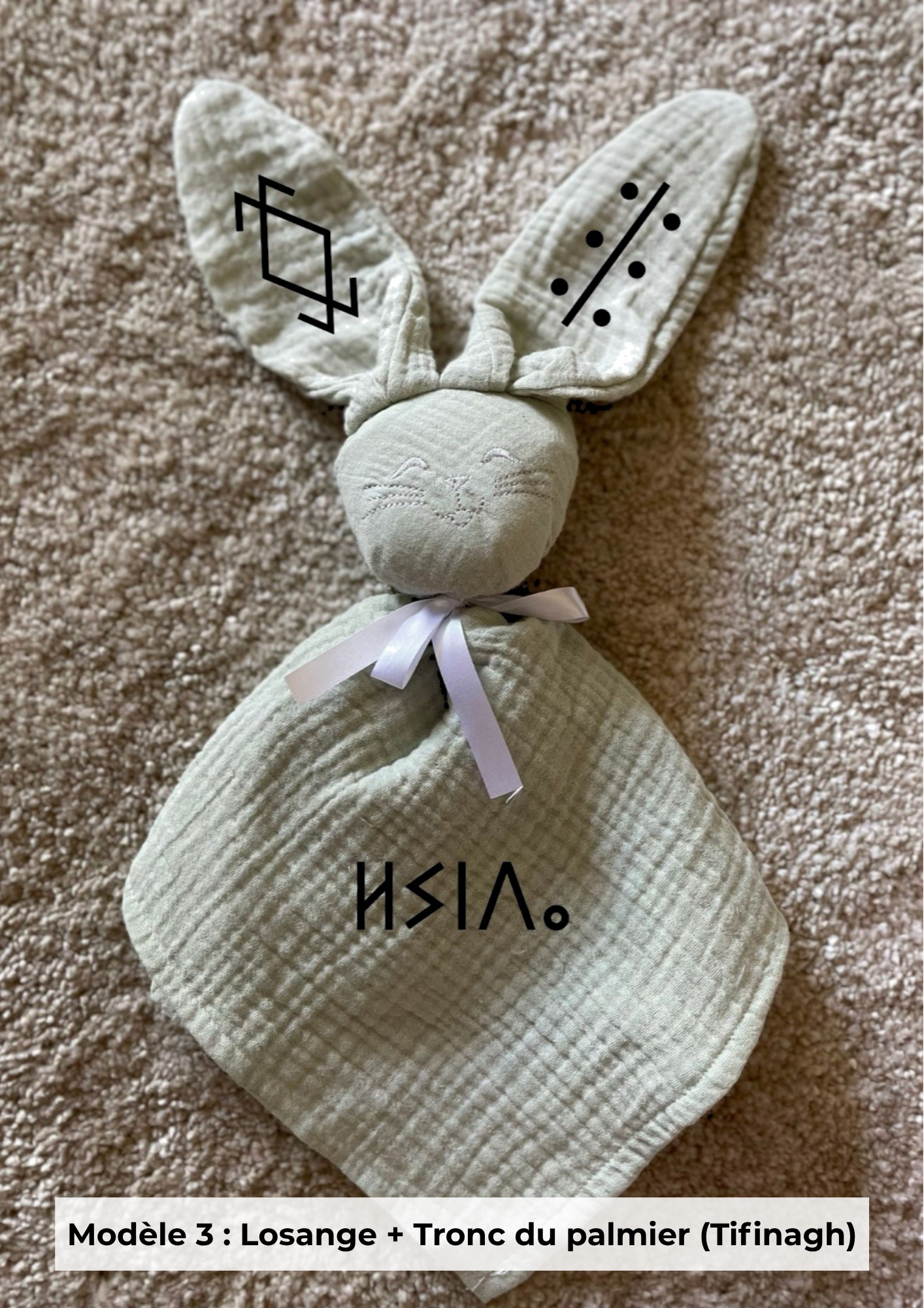 Le prénom est en tifinagh ou latin. Les symboles ne sont pas au choix libre : sélectionnez un modèle (photo 1, 2, 3 ou 4) qui associe alphabet + paire de symboles.