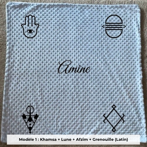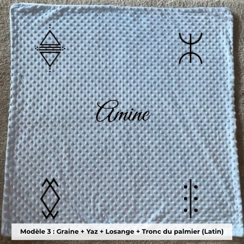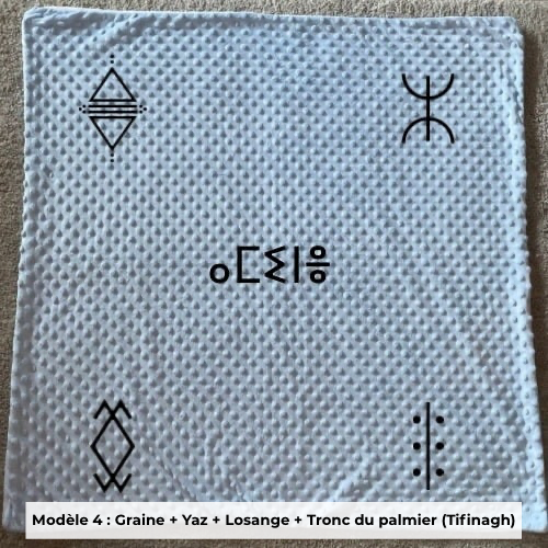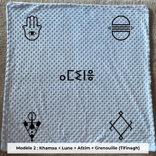 Le prénom est en tifinagh ou latin. Les symboles ne sont pas au choix libre : sélectionnez un modèle (photo 1, 2, 3 ou 4) qui associe alphabet + paire de symboles.